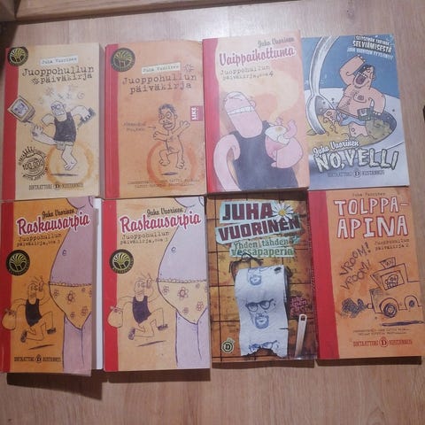 Juha Vuorisen kovakantiset kirjat, mukaan lukien Nokimusta Seikkailu ja Kakkonen, sekä muut teokset kuten Kristian siviilipalvelusmiehenä, Juoppohulkun päiväkirja osa 4 Vaippaihottumaa ja Raskausarpia. Hyväkuntoiset luetut kovakantiset kirjat. 3€ kpl tai kaikki viisi yht. 10€. Vain nouto Tuusula Riihikallio, ei postitusta.