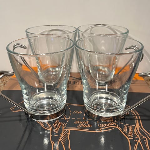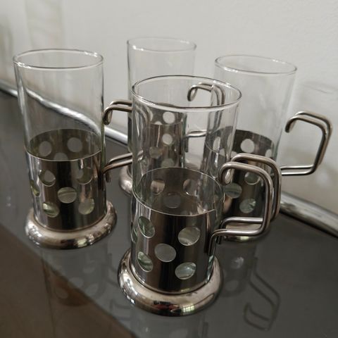 Lasiset glögi tai muille kuumille juomille tarkoitetut lasit, jossa metallinen pidike.