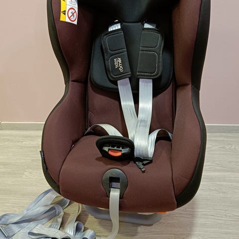 Hyvässä kunnossa oleva selkä menosuuntaan asennettava vyökiinnitteinen istuin. Sopiva 9kg-25 kg painoiselle lapselle. Mukaan saa myös auton penkkien suojan.