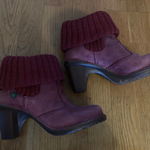 Mokkanahkaiset nilkkurit, ”turkis”-somistein. Toisen vetoketjun vedin irronnut. Muuten siistit ja ehjät kengät. Ohut vuori. Mukava lesti ja pitävä kumipohja.