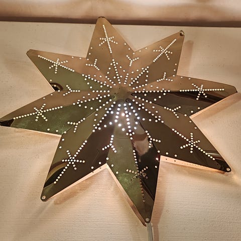 - Kultainen tähtikoriste. Ei valoja. Kiinnitysrengas. Ympärysmitta n 30 cm.