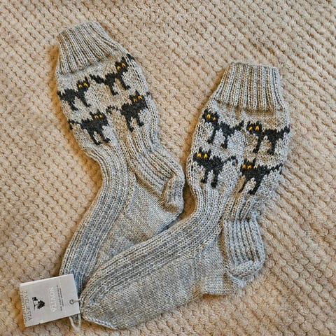 Kissakuvioiset käsin neulotut villasukat koko 39