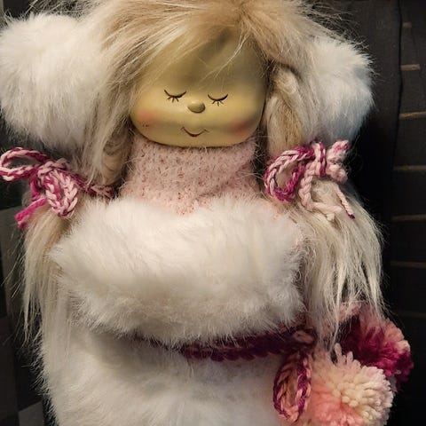 50 cm korkea nukke käsin tehdyssä aidossalapinpuvussa