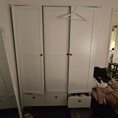 Toisessa kaapissa rekki ja toisessa hyllyt. Saa myös ostettua lisää hyllyjä. Toinen liukuovi on peiliä.
