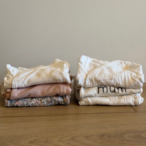 Vaatteet ovat ehjiä ja tahrattomia. Pinnassa saattaa olla hieman nukkaa, muuten siistissä kunnossa.
