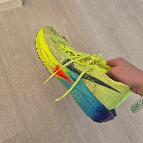 Vaalean siniset hiilikuitupohjalliset juoksukengät. Kengät ovat moitteettomassa kunnossa. Kengillä on juostu 2 maratonia ja 2 puolimaratonia. Joten kilometrejä takana alle 130km. Soveltuu hyvin jos oma kengän koko on 43-45 väliltä. Sovitus onnistuu koska tahansa.