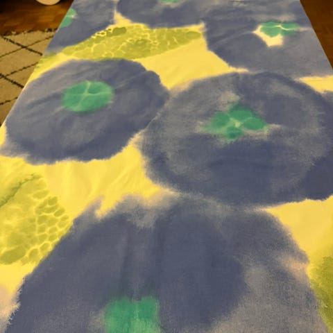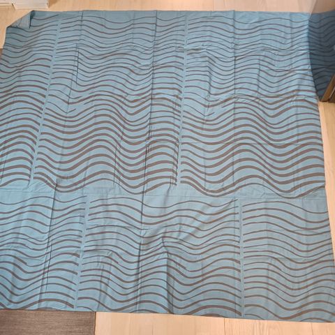 Marimekon Maija Isolan suunnittelemasta kankaasta Silkkikuikka ommeltu sininen pöytäliina. Koko noin 138 cm x 182 cm.