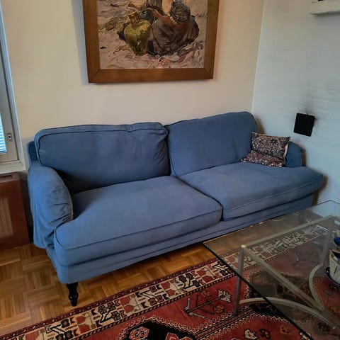 Siistissä kunnossa oleva sohva irrotettavilla tyynynpäällisillä. Istuinosan tyynyt hiukan painunut, mutta runko kunnossa.