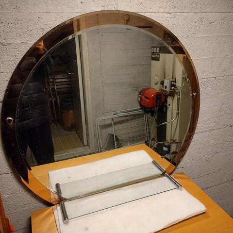 Myydään pyöreä musta peili. Saa ripustettua ripustuslenkistä seinälle tai sitten nojailemaan seinään. Halkaisija 40cm
