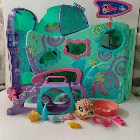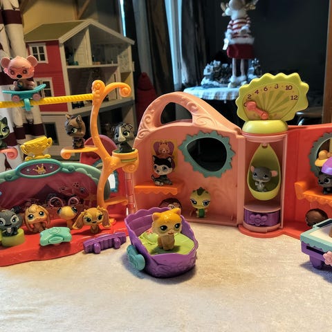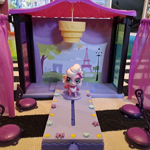 Littlest Petshop Sirkus estradi ja vaaleanpunainen, avattava neuvola/ eläinklinikka / terveysasema jossa on muun muassa vaaka ja röntgenpöytä sekä kuvassa näkyvät LPS-eläinhahmot.