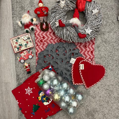 Sisustuspaketti joulun kattaukseen ja koristeluun: 4kpl puujäljitelmä katelautasta(käytetty mutta siisti kunto,ks.lisäkuvat), 4kpl punaisia käyttämättömiä kangas servettejä(puuvilla), 3pkt Ikea käyttämättömiä joulupalloja (3palloa/pkt, väri beige musta), sekä rottinkikori. Kissatalous. Mmm.