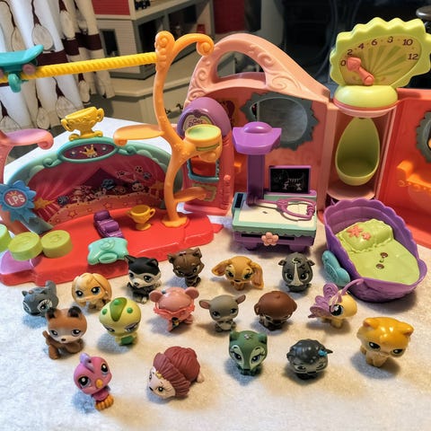 Littlest Petshop Sirkus estradi ja vaaleanpunainen, avattava neuvola/ eläinklinikka / terveysasema jossa on muun muassa vaaka ja röntgenpöytä sekä kuvassa näkyvät LPS-eläinhahmot.