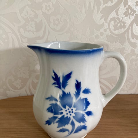Arabia kannu, jossa sinivalkoinen kukkakuvio. Materiaali posliinia. Soveltuu nesteiden tarjoiluun. Pienen kolhun saanut josta kuva, muuten ei krakea ja muita vikoja