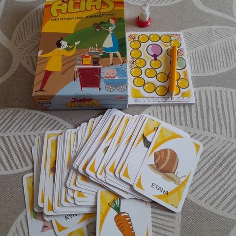Ihan ok kunnossa ja kortteja riittää + pelinappulat. Tiimalasia en löytänyt, eli joutuu kellottaa muulla tavoin.