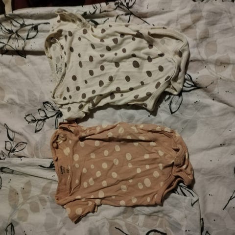 Kolme pitkähihaista bodya kokoa 68. Kaikissa kaula-aukon vasemmalla puolen 2 nepparia, joilla pään aukon saa auki hihan saumaan asti.