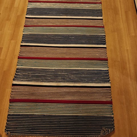 Matossa on jonkin verran kulumaa, mutta se on edelleen hyvässä kunnossa. Nukan pituus on säilynyt hyvin, ja matto on puhdas. Ei merkittäviä tahroja tai vaurioita.