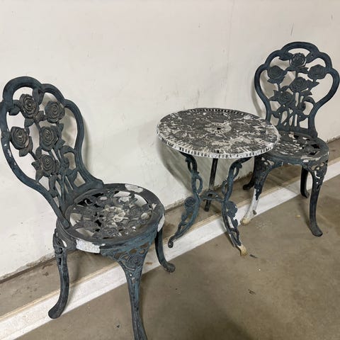 Tuolit ovat rungoiltaan hyvässä kunnossa, mutta kahdessa on istuimen remmit ja pehmusteet alta löystyneet. Huomioitu hinnassa.