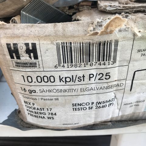 Laatikollinen hakasia 25x25,4. 1,6mm, sähkösinkitty liimakärjellä.. Esim. tuulensuojalevyjen kiinnitykseen tai huopatöihin, jne. Sopii esim. Senco P (WW5562), Testo SF2640, Bex 26/38. Kuvista näkee tarkemmin.