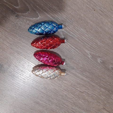 Myydään 5kpl vanhoja kuusenkoriste käpyjä. Punainen, turkoosi, pinkki x2, kulta (haalistunut). 70mm. Yht.30e.