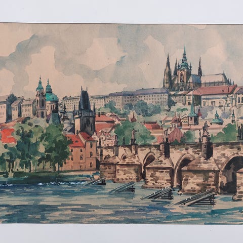 Teos esittää näkymän Prahan Kaarlensillalta kohti Vanhankaupungin puolta. Sommittelun keskipisteenä on ikoninen goottilainen tornirakennus, jota kehystävät sillan veistosryhmät ja kaupunkimiljöö.
