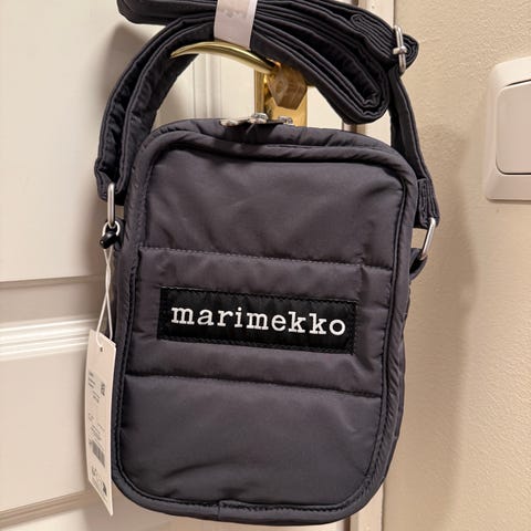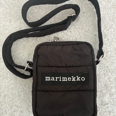 Myydään Marimekon tummanharmaa laukku. Hihnan pituutta voi säätää. Vetoketjusuljenta. Koko: 15 x 20 × 6 cm.