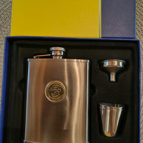 Tyylikäs taskumattisetti, jossa konjakinruskealla nahalla päällysetetty taskumatti 20cl sekä 2kpl teräksisiä kuppeja ja tratti. Tila kaiverrukselle. Käyttämättömät, alkuperäisessä paketissa.