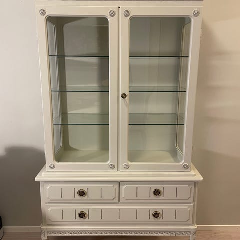 Upea puinen kustavilainen vitriinikaappi. Avaimet löytyy. Korkeus: 156cm, leveys: 102cm, syvyys: 35cm. Mukana irtonaisena kaappiin kuuluvat 15cm:n puujalat.