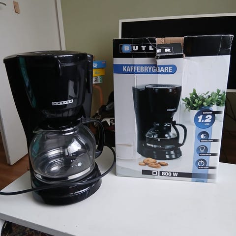 Butler 2091 kahvinkeitin, jossa on musta väri ja lasinen kannu, jossa mitta-asteikko 2-4 kupille. Ollut kaapissa käyttämättömänä muutaman vuoden.