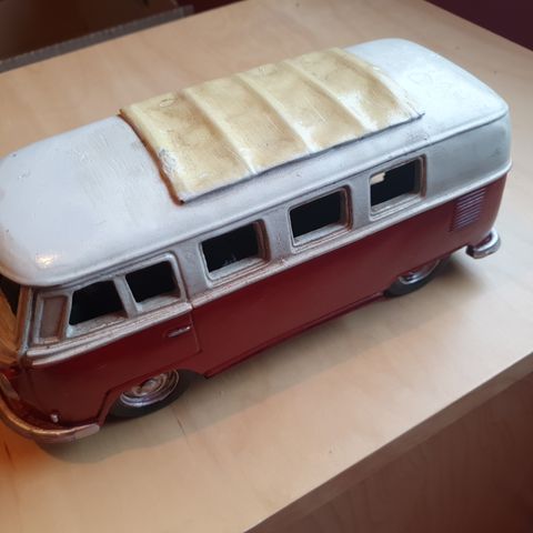 Volkswagen Microbus pienoismalli, vaaleanpunainen ja valkoinen väri. Malli esittää klassista Volkswagen pakettiautoa ja on kooltaan noin 12 cm pitkä. Pienoismalli on valmistettu muovista ja metallista, ja se sisältää yksityiskohtaisia ulkoasuominaisuuksia kuten avattavat ovet ja ikkunat.