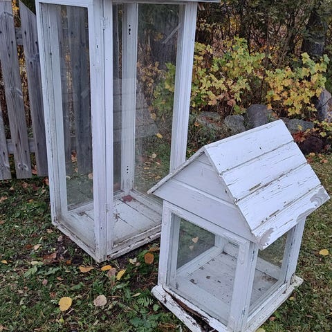 Myydään iso lasilyhty vanhoista ikkunoista tehty vaikka jouluvalolyhdyksi. Koukut valmiina sisällä.