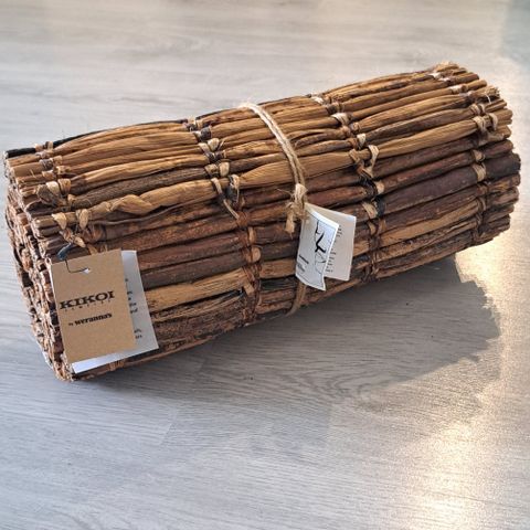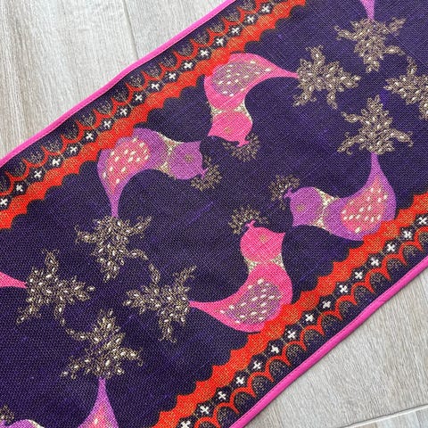 Käsityönä tehty kaitaliina. Lankana 50% kierrätettyä puuvillaa, 50% puuvillaa.