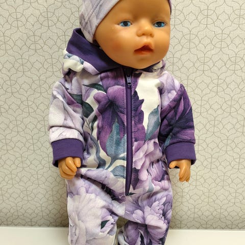 Ompelemani nuken haalari ja solmupanta puuvillakangasta. Haalari on pienenkin lapsen helppo pukea, kaikissa reunoissa on kuminauha. Sopii n 43cm nukelle. Myös nouto sopii.