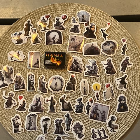 7 kpl erilaista Banksy tarraa. Tarrat esittävät muun muassa tyttöä keinussa, skeittaajaa ja muita Banksyn tunnettuja hahmoja.