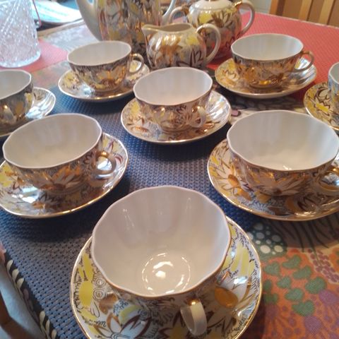 Lomonosovin teeastiasto. Kiva monipuolinen astiasto. Sarjassa teekannu, sokerikko,kermakko,kukkamaljakko, jalallinen tarjoilukulho, pullalautanen sekä 5teekuppia, 6tassia sekä 4asettia. Nämä yhteishintaan 225e. Halutessaan saa veloituksetta kupin(särö), asetti(pieni lohkeama) mukaan. Nouto Seinäjoki,Nurmo.