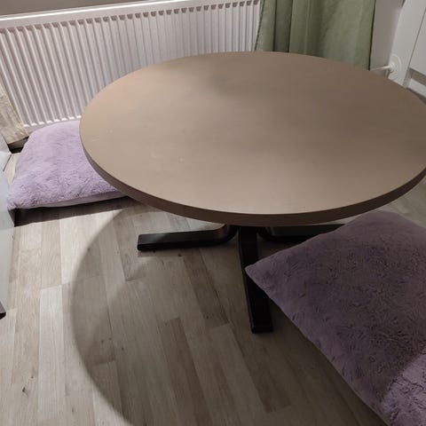 Täysin siisti pyöreä puinen pöytä, ei tahroia