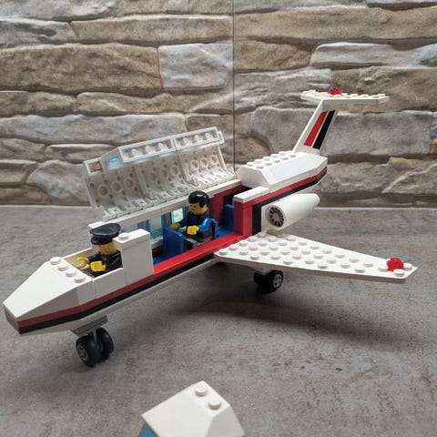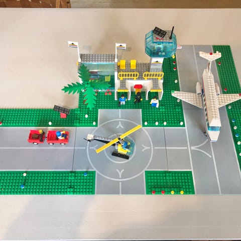 Puuttuvat osat nähtävissä kuvista: yksi valkopaitainen ukkeli lentokentän työntekijöistä, toinen kädessä oleva valkoinen merkkilaikka, lennonjohtotornin tarra, kaksi harmaata tarraa lentoaseman sisältä, sekä matkatavarakärryn keltainen valo korvattu kolmella keltaisella nappulalla. Matkalaukkuja on 2kpl ja kiitotien valoja kuvassa näkyvä määrä, näistä en ole aivan varma mikä on alkuperäinen määrä.