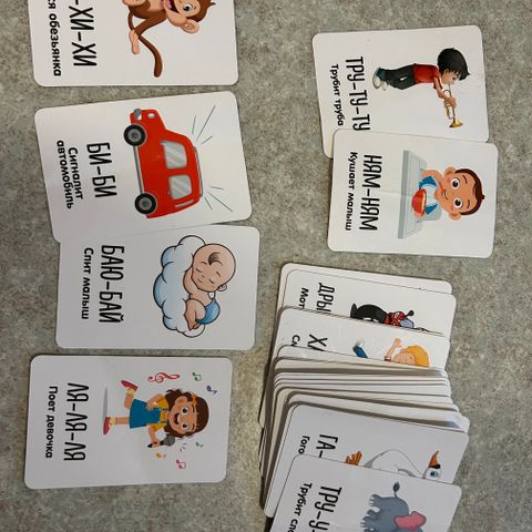 Kirkkaanvärisiä, kaksipuolisia kortteja paksulla, kiiltävällä kartongilla. Yhteensä 100 sanaa.