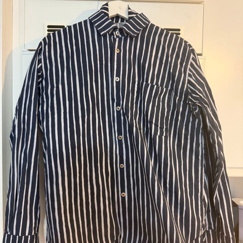 Marimekon sininen ja tummansinen raidallinen Jokapoika puuvillapaita. Koko M sekä S, Unisex.