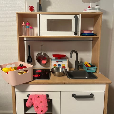 Siisti puinen lasten leikkikeittiö. Varusteltu liedellä, jossa valotoiminto (levyt syttyvät punaisiksi), tiskialtaalla ja hanalla, uunilla sekä yläkaapilla. Lisäksi koukkuja keittiövälineille ja hyvin säilytystilaa leikkeihin.