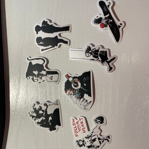 5 kpl erilaista Banksy tarraa. Tarrat esittävät Banksyn tunnettuja hahmoja.