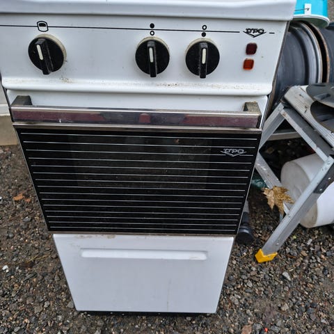 Suoraan käytöstä toimiva liesi. Peltilaatikosta lähtenyt toinen rulla ja siksi laatikko vinossa. Leveys 50cm, syvyys 60cm. Mukaan 3 peltiä.