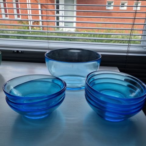 Iittala Verna -laseja ja jälkiruokakulhoja. Yhdessä lasissa pienenpieni särö mutta niin huomaamaton, ettei haittaa käyttöä. Jälkiruokakulhoja ei ole juuri ollenkaan käytetty, kaapissa olleet käyttämättömänä.