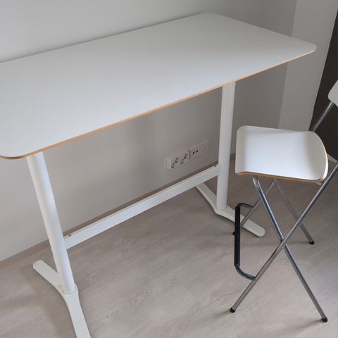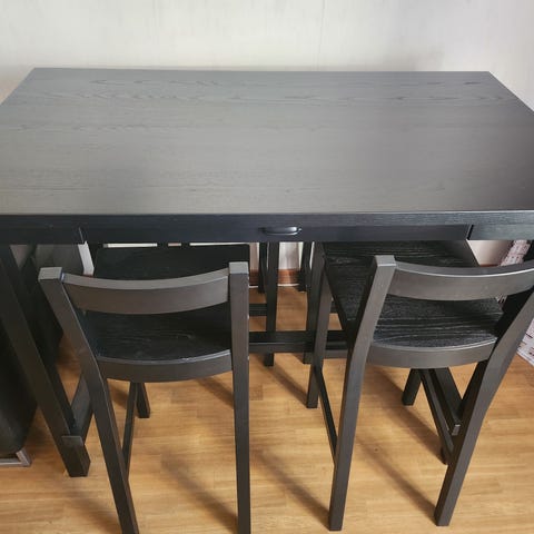 Myydään kuvan mukainen Ikean käytetty baaripöytä ja neljä ( 4 kpl) baarituoleja. Tuolit kunnostettu eli maalattu. Pöydässä jonkin verran käytönjälkiä rungossa mutta yleisesti ihan siisti.