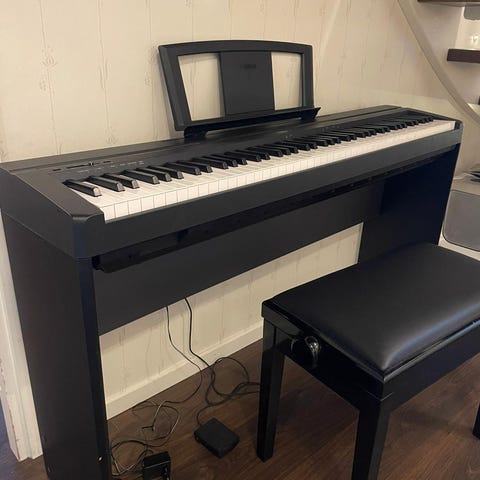 Yamaha P-80 digitaalisähköpiano, musta väri. Sisältää näppäimistön ja telineen. Sopii musiikin harjoitteluun ja esityksiin.