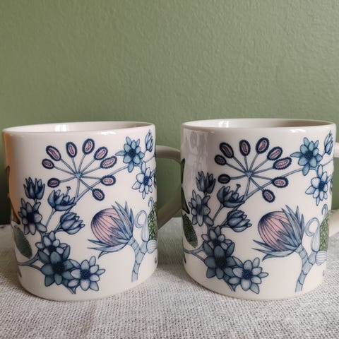 Myyntiin vähän käytetyt, uudenveroisessa kunnossa olevat Arabian Runo-sarjan Kevätkello-kuppi ja -pikkulautanen. Kupin vetoisuus 0,28 l, lautasen halkaisija 16,5 cm. Kevätkello-kuosia valmistettiin vuosina 2009-2013. Design Heini Riitahuhta.