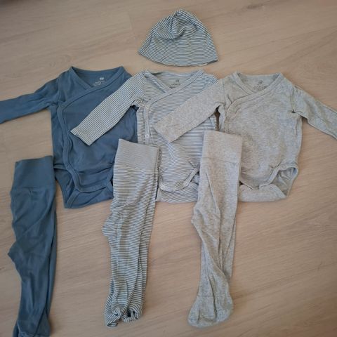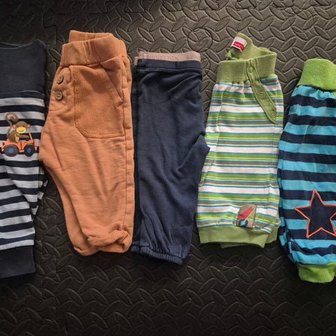 Haalarit ja kuvassa oikealla olevat housut ovatohuempaa puuvillaa. Mustat, harmaaraidalliset ja pystyraidalliset juhlavammat housut ovat paksumpaa collegemaista kangasta. Siniraidalliset housut velouria. Farkkujen vieressä ohuemmat puuvillatrikoohousut.