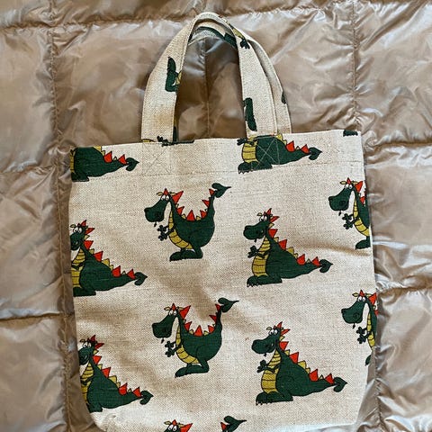 Käytetty musta kangaskassi Janoinen Lohi. Toisella sivulla painatus