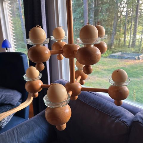 Mäntypuinen kahden kynttilän Aarikka kattokruunu löytyy Aarikan vuoden 1980 kuvastosta (punaiseksi maalattuna numerolla 6008). Nyt myynnissä on maalaamatonta puuta oleva Aarikka valaisin, joka on 82 cm korkea ja noin 33 cm leveä. Aarikka kynttilävalaisin on täysin ehjä ja hyväkuntoinen. Harvinainen ja upea!