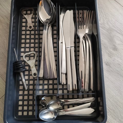 Sekalainen setti aterimia. Muutamaa eri sarjaa. Osa ainakin Ikeasta