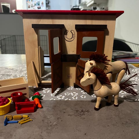 Breyer-paketti, johon sisältyy este, 4 aitaa, 3 purkkia, rehukaukalo ja harjapakki.